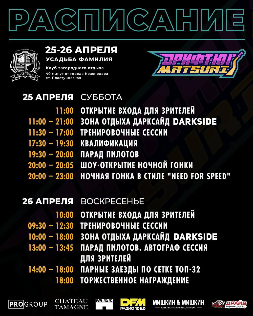 В последние выходные апреля «Усадьба Фамилия» превратится в эпицентр японской уличной культуры и скоростного дрифта. Фестиваль «Дрифт-Юг Matsuri» даёт официальный старт летнему сезону 25–26 апреля. В борьбе за Летний кубок на этом этапе зрителей ждёт уникальное шоу — ночная гонка в стиле культовой видеоигры Need for Speed, море дыма и неоновые огни.