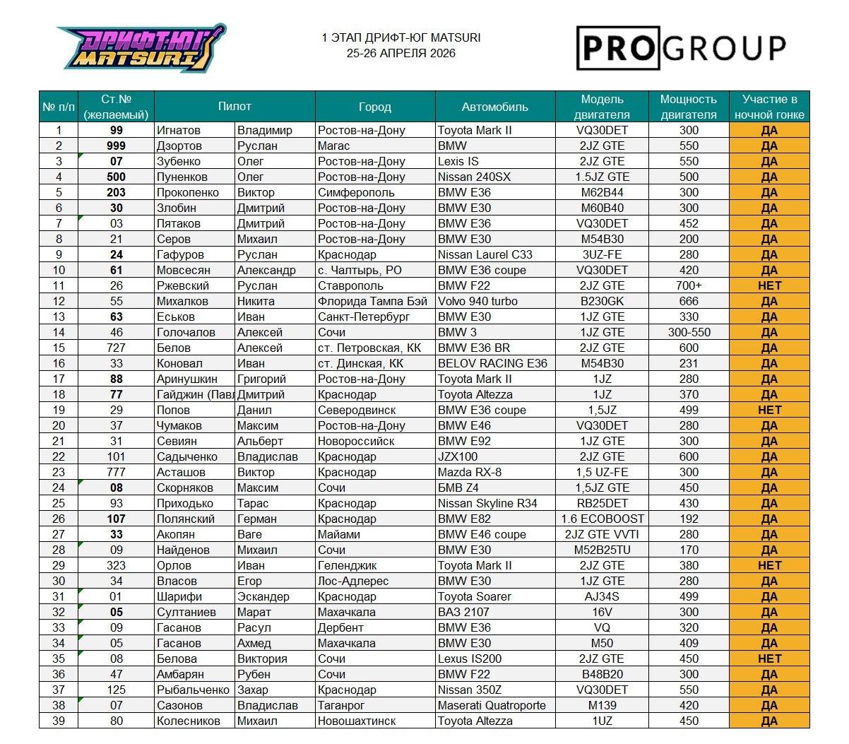 Среди участников — как новички, так и силовики, а также представители нового поколения дрифта: несовершеннолетние спортсмены, выступающие наравне со взрослыми. Промежуточный список заявленных пилотов: